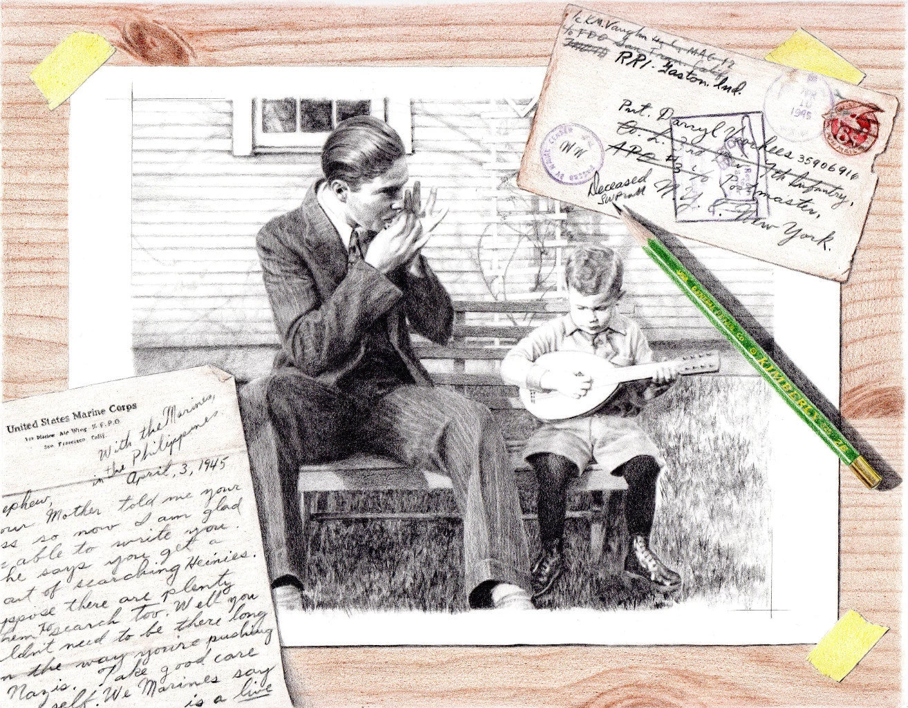 “All Quiet, is dedicated to Darryl Voorhees (b. April 25, 1926 – d. April 18,1945) and to all those who have bravely given their lives in active militaryservice. Depicted is my grandfather, Kenneth M. Vaughn with his nephew, DarrylVoorhees. The reference photo was taken around 1930. The letter in theforeground, postmarked April 10, 1945, is from my grandfather, who was serving inthe U.S. Marines during WWII. It is addressed to his nephew, Darryl, who wasalso serving in WWII with the U.S. Marines in Europe. The letter was returnedunopened. On April 18, 1945, Darryl Voorhees was killed in action, just one weekprior to his 19th birthday.“