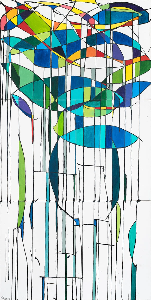The inspiration and process of my creating this series was the challenge of using acrylic ink to create the sweeping trees that were painted by Piet Mondrian. Using the ink I tried to create the sweeping motion from side to side. Without realizing it I was using some of the color palettes to also create a movement along w/the ink lines to travel from one side of the tree to the other. Number 5 was an expansion of the 24×36 to 36×72.