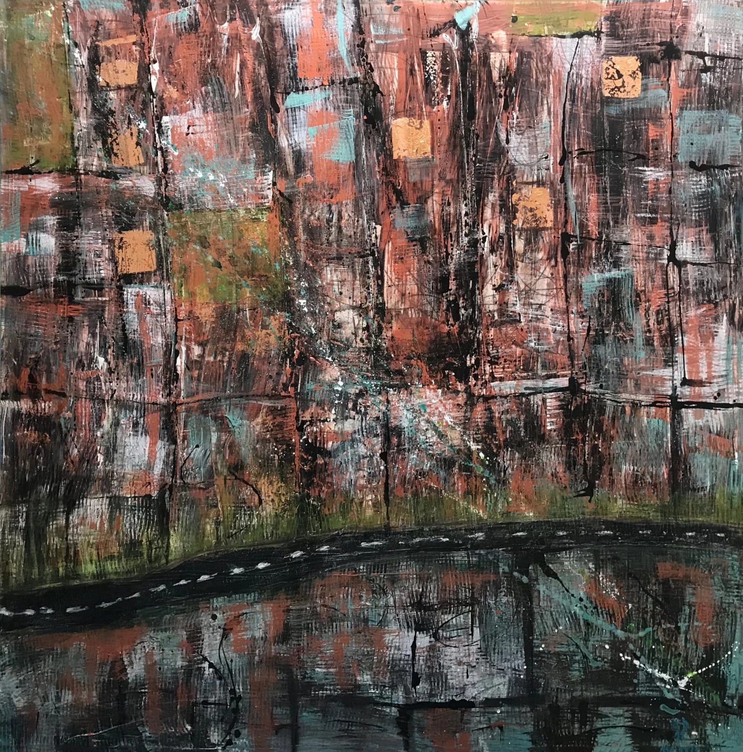 “Architecture has an organic element within its structure. It has been a lifelong interest to read about great architects and their internal view of their designs. As an artist, my goal with this series was twofold. I wanted to work with the idea of mixed media, movement, texture, and simplicity to define the framework of each painting. Acrylic paints, inks, pastel chalks, gold & silver leaf, and textural tools gave me the opportunity to express my emotions and respect for space. Secondly, large canvases gave me that space. A space to explore, demonstrate and feel the value of these architectural elements in my work. My inspiration is always tied to the Journey we each make in Life. This series has been my latest effort in continuing to define my artistic and personal journey.”