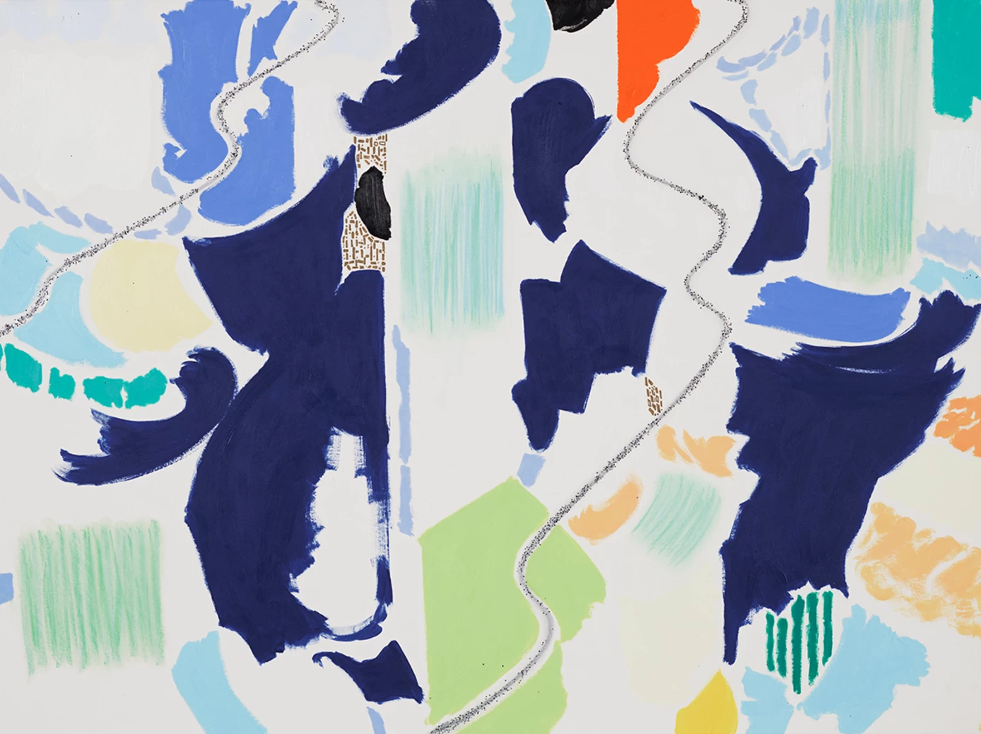 “Abstract, nebulous, soft, forms invite the viewer into imaginary landscapes in this colorful series. The perspectival depth changes as some shapes resonate vertically, and suggestions of patterns and architectural motifs shift the viewer’s scale orientation. The variation of shimmery and matte surfaces furthers the play of light as an orienting factor. The world, these paintings suggest, no matter how solid-seeming, takes on a spiritual, playfully alive and metaphysical dimension that is always shape-shifting, moving, rhythmic, fun, and dynamic.”