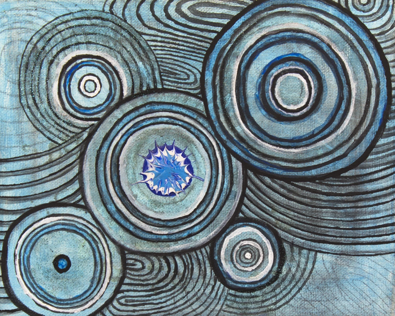 In this geometric art print by Kitty Zen, light blue orbs float together around wavy lines, flowing haphazardly through the work.