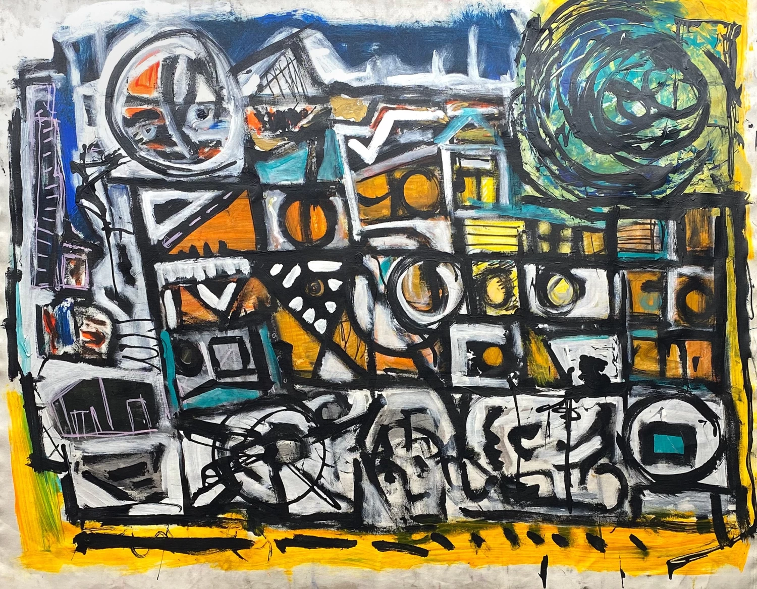“This began with a clear top and bottom almost like beginning a picture of a horizon. I began adding squares turning it into a wall that jutted out at you and the sky above was chaotic and intense. As I added depth and focus I struck the balance of circles and squares as the title suggests.”
