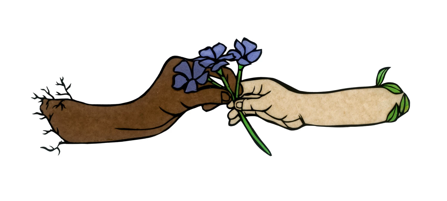 “Inspired by Gwendolyn Brooks’s poem, Second Sermon on the Warpland, this cut paper shows the hand of ancestors reaching out to the younger generation to give them their flowers. It is a design that demonstrates a connection to the past. Through their hardship, older generations of Blacks continued to prosper and succeed, and for the younger generation to learn from them.”