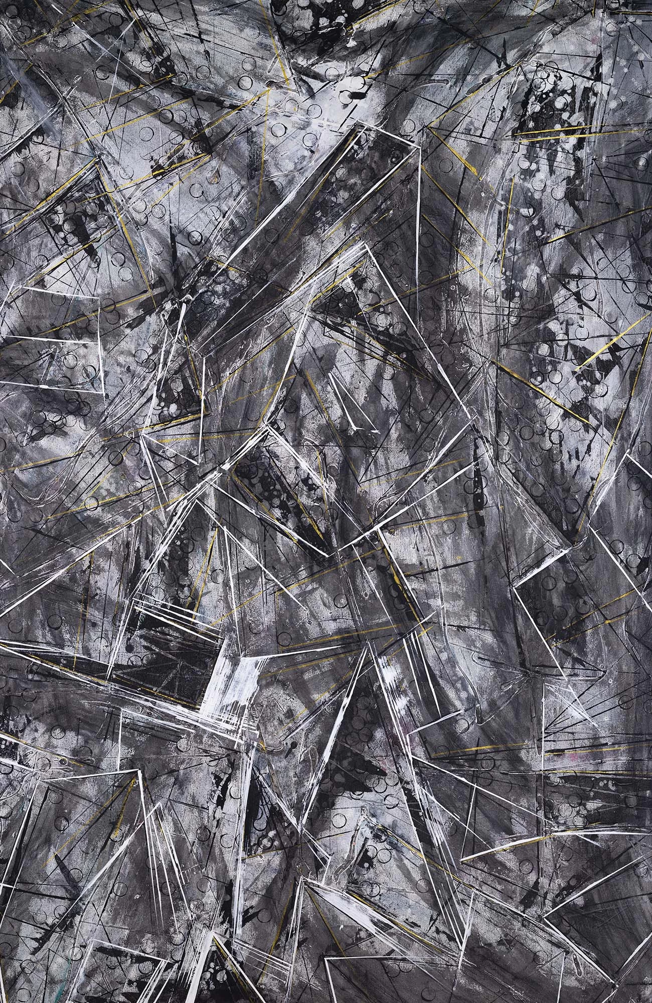 “I made from a roll of canvas and with about 10 layers to it and started as a colorful collaboration with friends and hung it up for months until I didn’t feel it was alive so I went solo on finishing it keeping the basic structure but adding major elements of complexity and releasing my newfound anxiety. I worked several days in a row on this for hours at a time only using a straight edge spackle tool and brush and paint imprint. I created my inner emotion.”