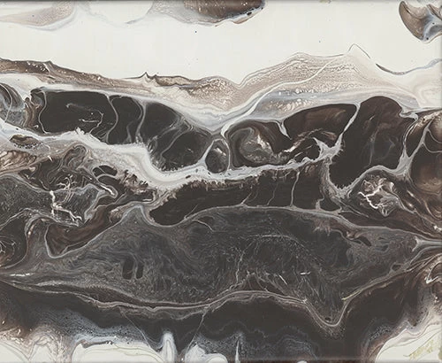 “My husband and I fell in love with a piece of granite called “Meteor Shower” from Brazil, looking over granite slabs during 2015. I wanted to work with a new medium I had gotten and I wanted it to be able to hang them where they would complement browns, black, and ivory-white that is in our kitchen near this granite on the kitchen island. Each one is done a little differently, but has our interior house paint (Dunn Edwards Antique Paper) color as the ivory, and has a different chemical added to each one – but designed to work together as a series. They are some of our favorite pieces and were created to hang in a certain place in our kitchen!”