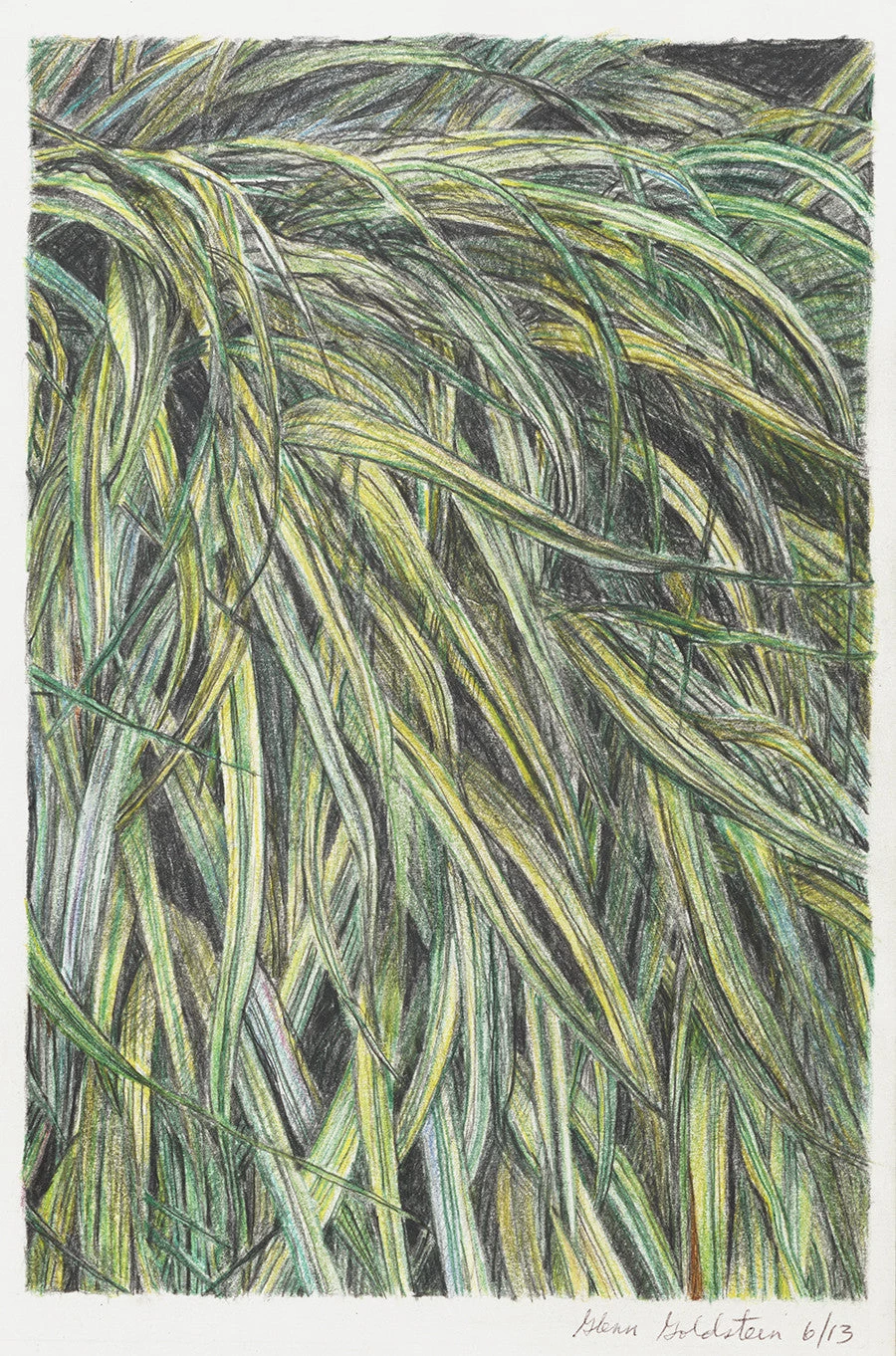 “This one was a real pain not realizing what I was attempting in the beginning. It took me 30-60 hours of work alone. The challenge was to try and watch the edges of grass leaves, lines beginning and ending and of course placement, proportion too. Prismacolor pencils were used.“