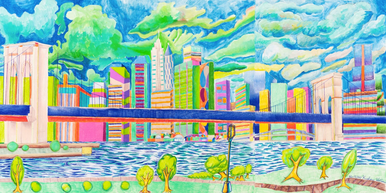 “I was inspired about doing colors in the building. I then added even more colors in the background and the foreground too. I try to use green and yellows in the sky. Acrylic makes it look more realistic. The paint makes the clouds look more real – that’s why I like doing it acrylic.”